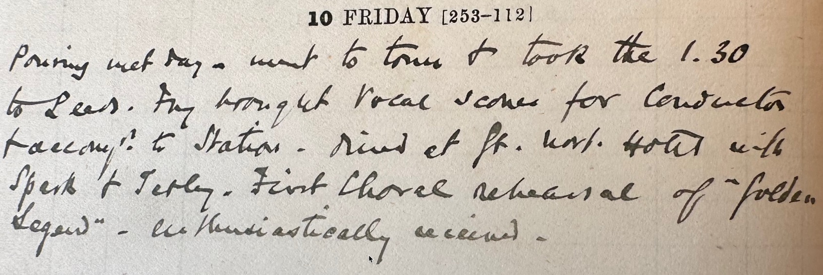 Pouring wet day – went to town & took the 1.30 to Leeds. Fry brought vocal scores for conductor and [accompanists] to Station – dined at [Great Northern] Hotel with Spark & Tetley. First Choral rehearsal of “Golden Legend” – enthusiastically received.