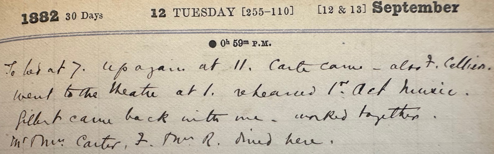 Carte was of course Richard D’Oyly Carte, and Cellier was Frank Cellier. You gotta wonder why they called, when they presumably “knew” they’d soon be seeing Sullivan in the theatre that afternoon.