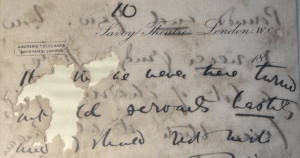 The “2nd Act” here is that of The Rose of Persia. The “trike” is what you think it is! But finally here Sullivan is spelling it with an i rather than y. The “long letter” is from Helen Carte (nee Lenoir, nee Black). I don’t have a copy of that letter, but in a previous letter (August 4), Helen tries to wrap her head around all the ladies the new opera will require: