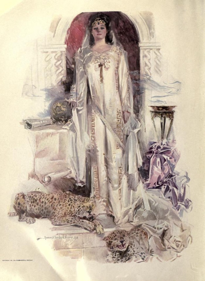 So when does it happen? The surprising answer is, long after the action presented in Princess Ida ends. In Tennyson, the Prince was wounded in the tournament, and was attended to by Ida and the other women. Their falling in love was a slow process. At first, Ida noticed Cyril and Psyche falling in love. Then other men and women paired up in the castle. King Gama was there too, and King Hildebrand, and Ida’s brothers and they all pressured her to accept the Prince. Over time: