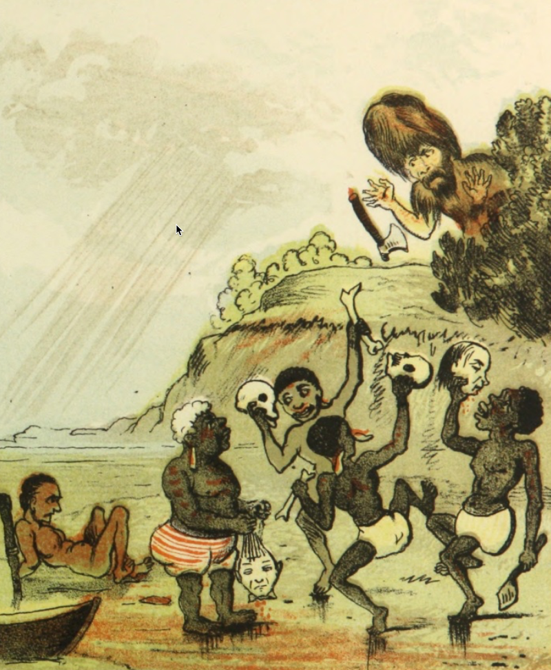 Dean & Son was a London publishing firm that pioneered “toy books” for children. Around 1870 they produced Ridiculous Robinson Crusoe, which you may read here. The book begins with a young lad who dreams of going to sea, but his father objects. He nonetheless sails off on a ship, where other boys torture him and play practical jokes. Their voyage is very smooth for some days: